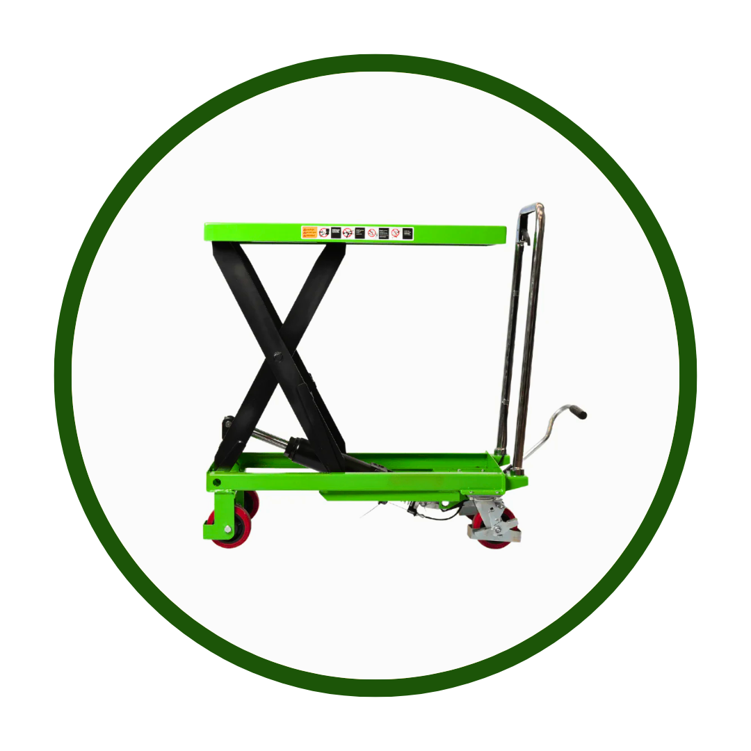 We offer electric-hydraulic lift tables (foot-pedal or push-button control with powered lift), manual hydraulic (foot-pump operated), and spring-assisted models. Electric models are best for frequent use and heavy loads. Manual models work well for occasional lifting with lighter loads.